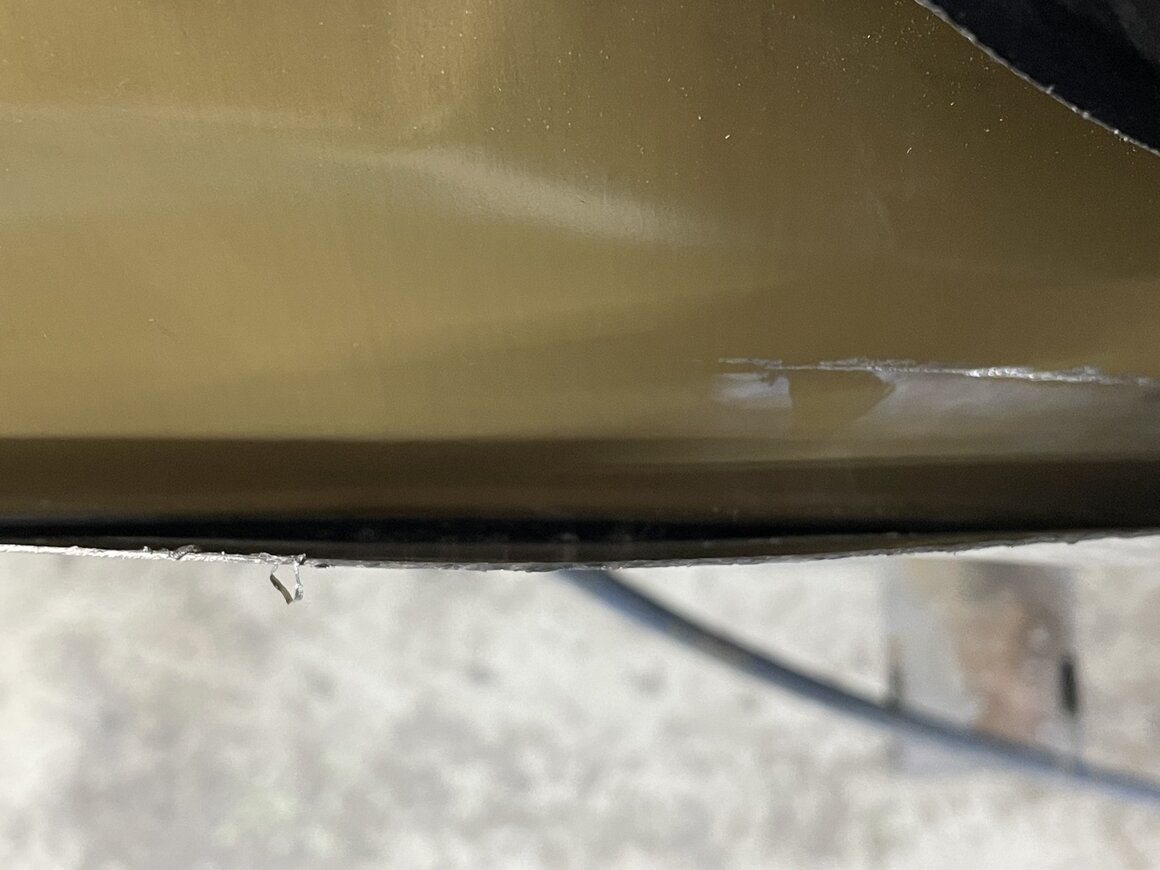 Deformierte Seitenwand. Bereits durch den Schaden wurde die Verklebung in einem Bereich von mehreren Zentimetern gelöst. Wir haben die Deformation zwecks Demonstration mittels Push-Pull zurückgeformt. Dabei hat sich die Verklebung auf einer Fläche von 30 cm gelöst. In diesem Fall muss die Seitenwand für eine hochwertige Instandsetzung zweifelsfrei ersetzt werden.